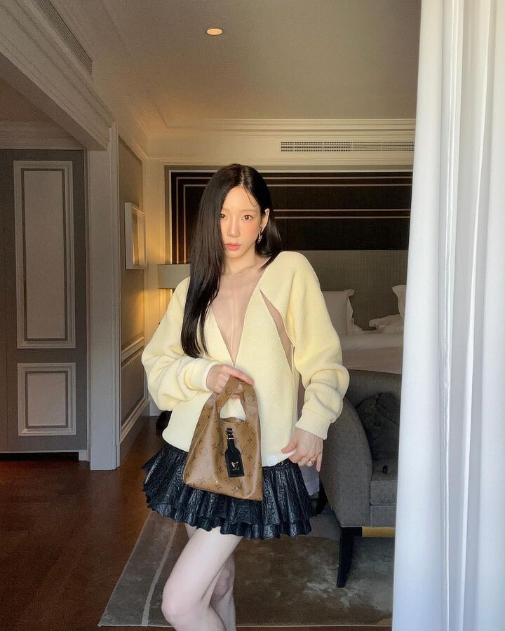 要怎么把购物袋包型背得好看?我们可以参考秀上模特儿的使用方式。将其中一边的手柄套入另一边,接着只需拎着上方的手柄就好,让柔软的包身自然的压褶,才能展现出慵懒不羁的精髓,迷你尺寸的话怎么提都可爱!像太妍先前参加时装秀时便已背上。