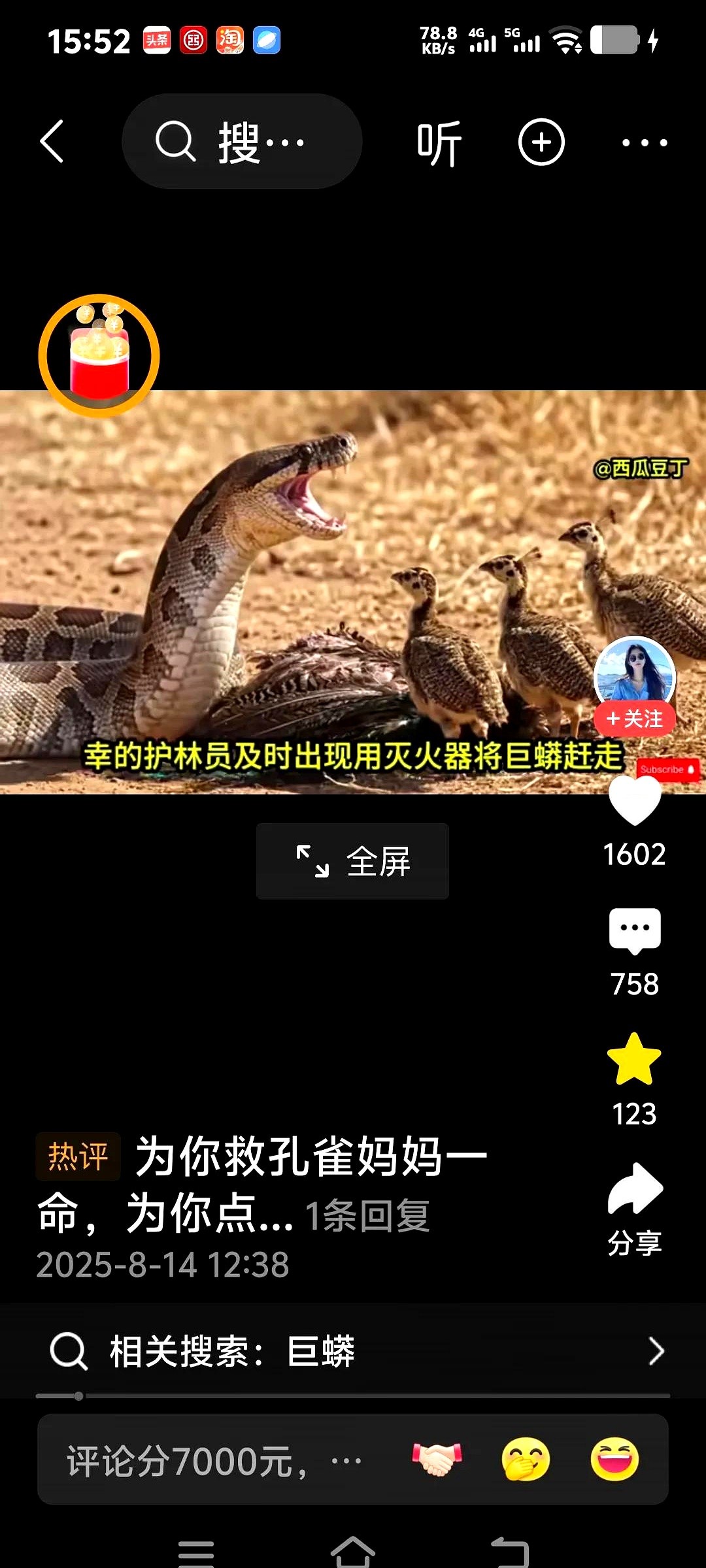有人搜了一下:南滚河去年红外相机还拍到过7公斤眼镜王蛇捕食孔雀雏,这片林子里孔雀只剩300只上下,巨蟒倒是年年见,密度翻了倍。