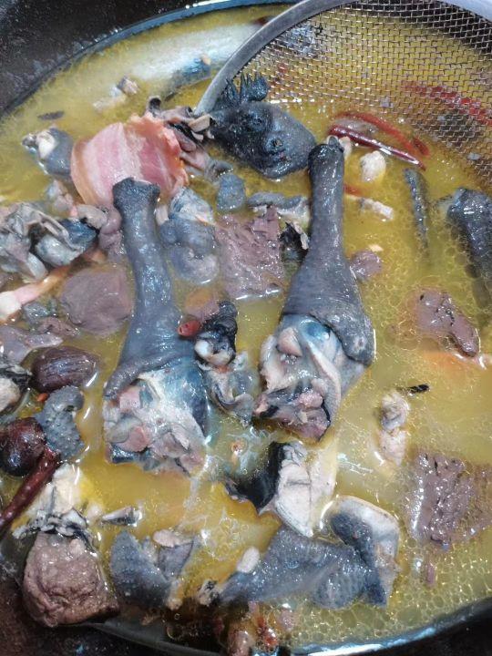 手撕鸡肉烂饭的制作程序为:将收拾好的鸡体在清水中煮熟,捞出鸡后将淘洗好的大米倒入鸡汤里煮,稍煮一阵放入一把酸笋,至大米煮烂,稠度在米饭与稀粥之间为止,端下盖好。这时,用手将煮熟的鸡肉撕碎成肉丝块,将备好的薄荷叶、茴香、香辣蓼等切细撤在鸡丝块上,再撤上花椒面、食盐、辣椒面,加以搅拌均匀倒入烂饭调匀即可上席使用。